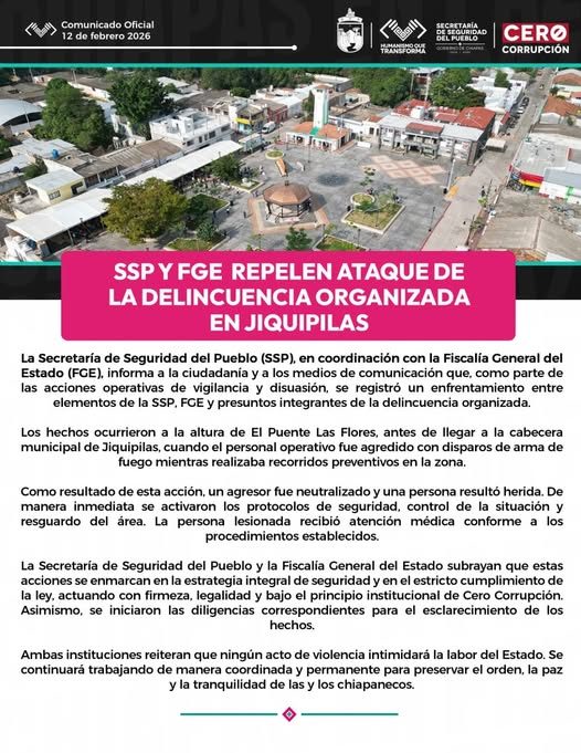 Jiquipilas, Chiapas, 12 de febrero de 2026.- La Secretaría de Seguridad del Pueblo (SSP), en coordinación con la Fiscalía General…