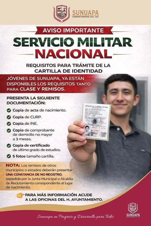 El H. Ayuntamiento de Sunuapa informa a la ciudadanía que ya se encuentran disponibles los requisitos para el trámite de la Cartilla de Identidad del Servicio Militar Nacional, tanto para clase y remisos.