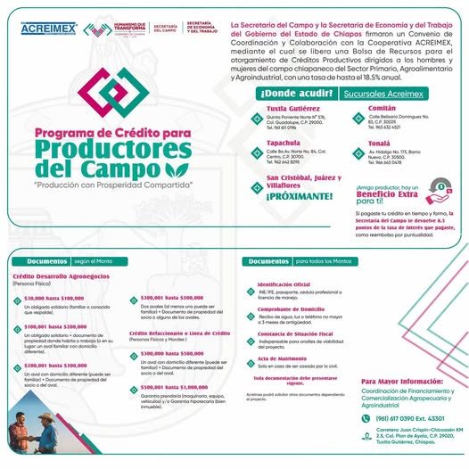 #RequisitosParaCreditos en el #Campo de #Chiapas El Gobierno de Chiapas impulsa el financiamiento al campo, dirigida a pequeños y medianos…