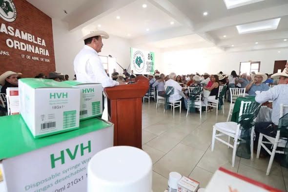 El secretario Marco Antonio Barba Arrocha entregó, en el marco de la Semana del Campo, apoyos al sector ganadero durante la 86 Asamblea General Ordinaria de la Unión Ganadera Regional de Chiapas, en representación del gobernador Eduardo Ramírez Aguilar.