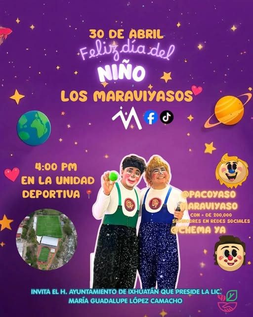 30 de abril de 2026, a las 4:00 de la tarde en la Unidad Deportiva Santa Cruz, llegan los Payasos Maraviyasos con un show que no has visto.