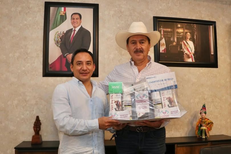 El secretario del Campo, Marco Antonio Barba Arrocha, entregó medicamentos gratuitos para la prevención del gusano barrenador 2026 al presidente municipal de Yajalón, Juan Alberto Utrilla López, en el marco de una reunión de trabajo enfocada en la sanidad pecuaria.