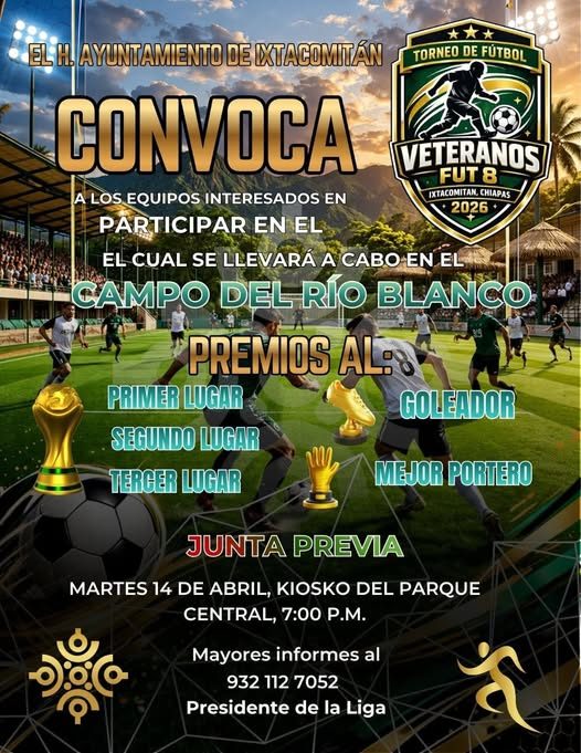 ¡Todo listo para el gran TORNEO DE FÚTBOL VETERANOS FUT 8! INSCRIPCIONES ABIERTAS: JUNTA PREVIA MAÑANA MARTES 14 7 PM…