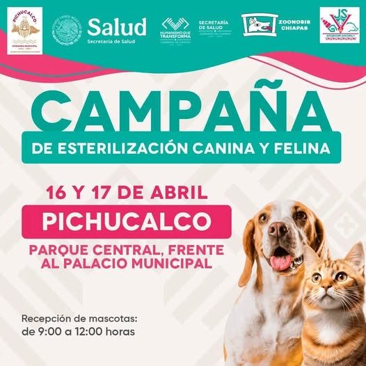 ¡Recuerda! Los días 16 y 17 de abril se llevará a cabo la campaña de esterilización gratuita de perros y gatos en Pichucalco.