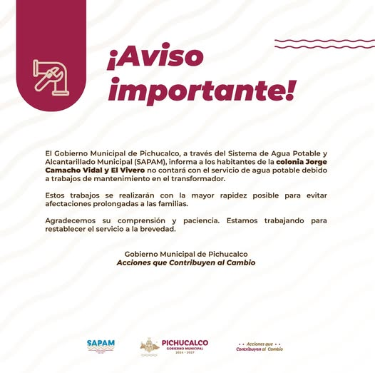 El Gobierno Municipal que preside el Maestro Andrés Carballo Córdova, en coordinación con SAPAM, informa: