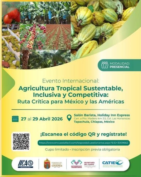 Tapachula será punto de encuentro para el análisis estratégico del futuro agroalimentario en el hemisferio. Del 27 al 29 de abril de 2026, líderes institucionales, especialistas y productores participarán en el evento internacional de alto nivel “Agricultura Tropical Sustentable, Inclusiva y Competitiva”, orientado a fortalecer la productividad, la innovación y la resiliencia en los sistemas agrícolas.