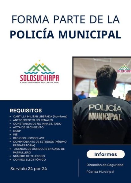El H. Ayuntamiento de Solosuchiapa invita a hombres y mujeres comprometidos con su comunidad a formar parte de la Policía Municipal.