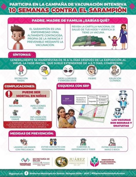 Con el objetivo de proteger la salud de la población y prevenir la propagación del sarampión, el Gobierno Municipal que preside Oscar Serra Cantoral, en coordinación con la Secretaría de Salud del Estado y la Dirección de Salud Pública Municipal, invita a la población en general, especialmente a madres, padres y tutores, a sumarse a la Campaña de Vacunación Intensiva “10 Semanas contra el Sarampión”.