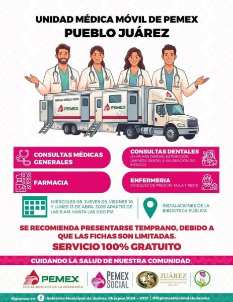 El Gobierno Municipal que preside Oscar Serra Cantoral, en coordinación con PEMEX Social, instalarán en la localidad de Pueblo Juárez la Unidad Médica Móvil de PEMEX, con el propósito de acercar servicios de salud gratuitos y oportunos a la población, fortaleciendo la atención preventiva y el bienestar de las familias del municipio.
