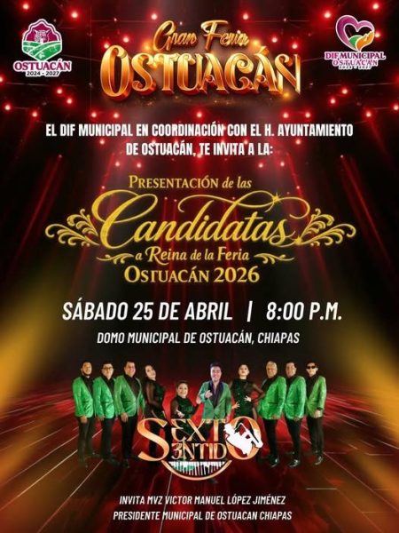 Todos están Cordialmente invitados a disfrutar de la presentación de las candidatas a Reina de la feria 2026 y al terminar todos a bailar con el grupo SEXTO SENTIDO.
