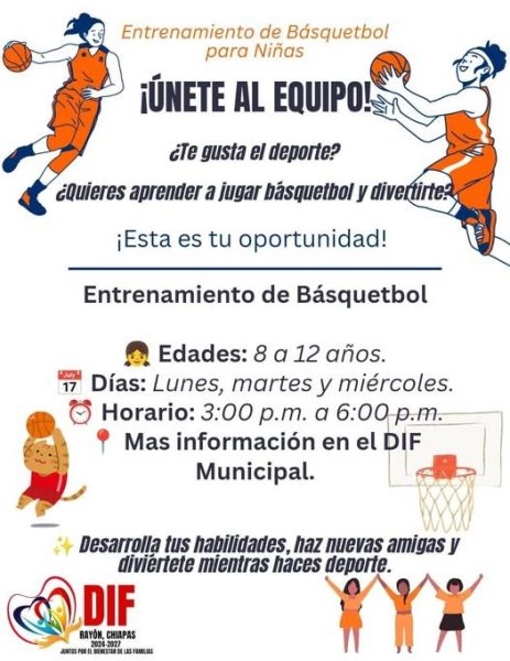 El Sistema DIF Municipal de Rayón, Chiapas que preside la Lic. Sonia Adelis Hernández González, extiende una cordial invitación a todas las niñas de 8 a 12 años de edad de nuestro municipio que deseen aprender, jugar y divertirse en la cancha.