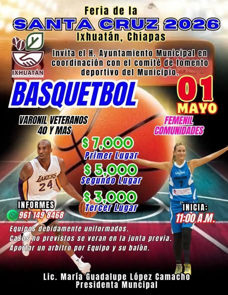 No te pierdas lo eventos de Basquetbol que se estarán realizando del 1 al 3 de mayo en la Unidad Deportiva Santa Cruz de Ixhuatán, no falten, seguimos fomentando el deporte en nuestro Municipio, vamos por mas.