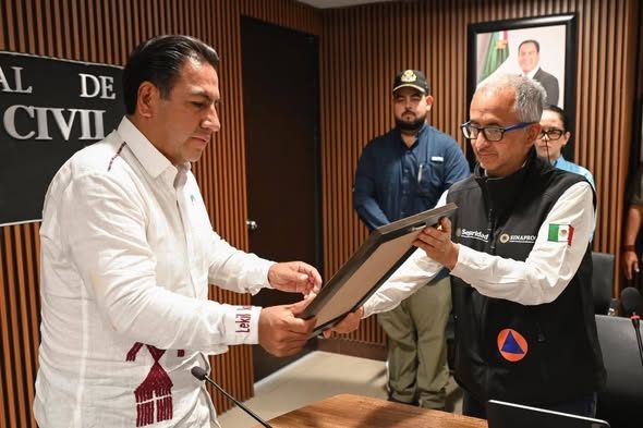 En ese marco, el director general del Centro Nacional de Prevención de Desastres (Cenapred) de la Secretaría de Seguridad y Protección Ciudadana (SSPC), Enrique Guevara Ortiz, entregó un reconocimiento al gobernador por los avances y resultados obtenidos en la Evaluación Nacional del Índice de Gestión de Riesgos de Desastres. Subrayó el trabajo coordinado con la comunidad mediante los Comités Humanistas, las acciones en territorio, la disminución de incendios forestales y la integración de la nueva Ley de Gestión Integral de Riesgos.
