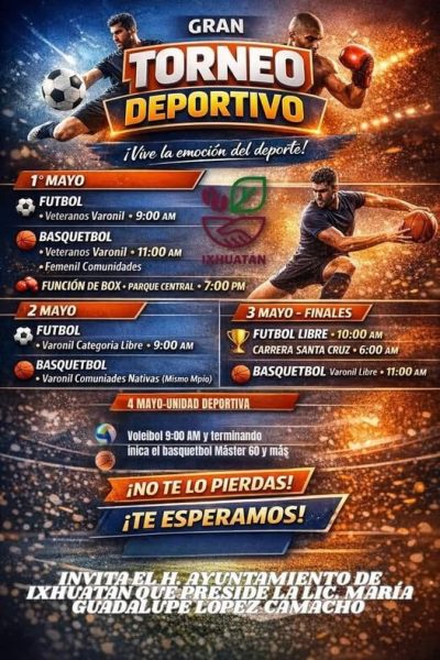 Invitados a ver los eventos deportivos en la Unidad Deportiva Santa Cruz en un ambiente familiar, del 1 al 4 de mayo, quedan coordialmente invitados.