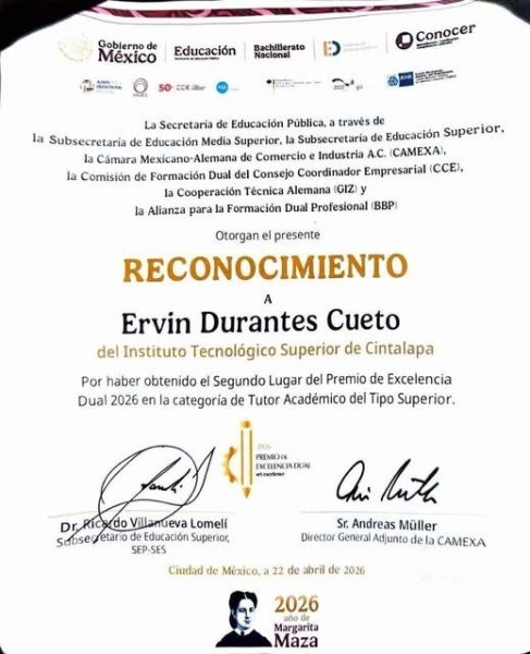 El Tecnológico Nacional de México (TecNM), Campus Cintalapa, ha sido distinguido con el 2º lugar en el Premio de Excelencia Dual 2026, consolidándose como un referente nacional en la formación integral de estudiantes.