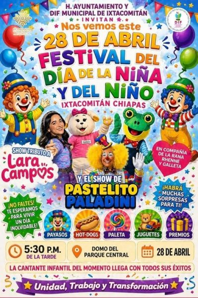 El H. Ayuntamiento de Ixtacomitan Chiapas y DIF Municipal, que preside el ING Miguel Angel Moreno Palacios , en coordinación con la Presidenta del DIF Municipal, la Mtra.Blanca Olivia Estrada Rueda, te invitan a festejar a lo más valioso de nuestros hogares: ¡nuestras niñas y niños! ![]()