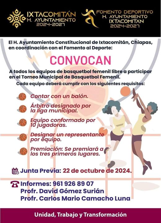 El H. Ayuntamiento de Ixtacomitán, Chiapas 2024-2027, que preside Miguel Angel Moreno Palacios invita a todos los equipos a participar en el Campeonato Municipal de Basquetbol Femenil Libre que se celebrará en la Unidad Deportiva.