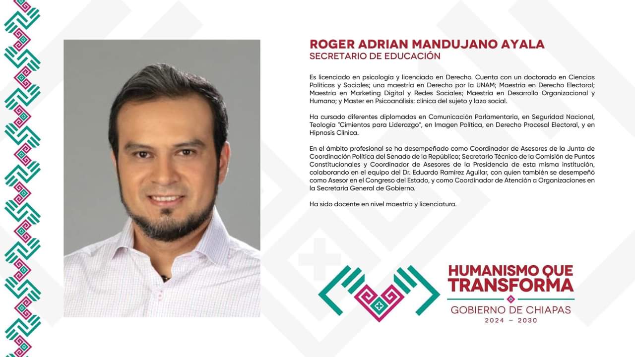 • Roger Adrián Mandujano Ayala, titular de la Secretaría de Educación.
