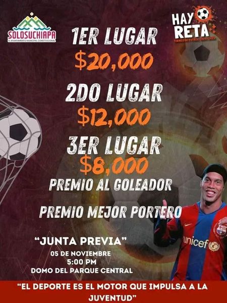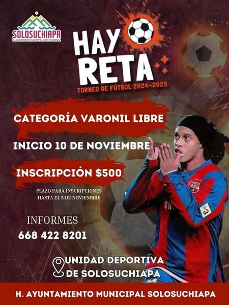 El H. Ayuntamiento de Solosuchiapa que preside el Ing. Fernando Aparicio Gómez, tiene el placer de invitar a todos los amantes del fútbol a participar en nuestro emocionante torneo de fútbol, las inscripciones estarán abiertas hasta el 5 de noviembre.