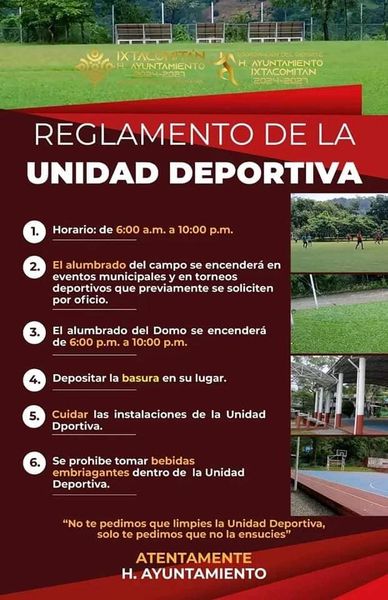 Los espacios públicos son para el disfrute y bienestar de toda nuestra comunidad. La unidad deportiva es un lugar donde podemos compartir, ejercitarnos y ver a nuestros niños, jóvenes y adultos disfrutar. ¡Vamos a cuidarla!