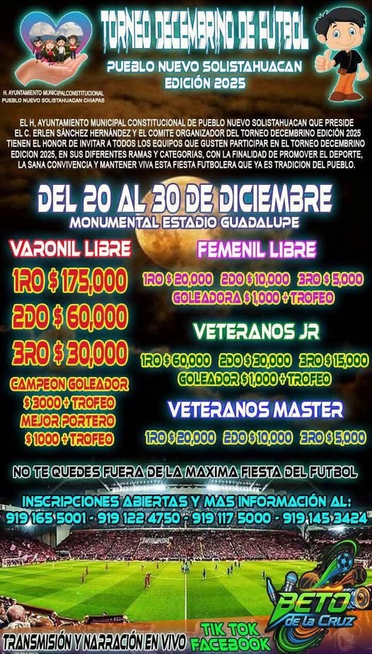Extiende una atenta y cordial invitación a todos los equipos de fútbol, en sus ramas varonil y femenil, en las categorías libre y veteranos junior y máster, a participar en el Gran Torneo Decembrino 2025.