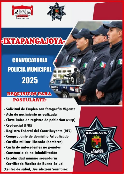 El Gobierno Municipal de Ixtapangajoya informa a la ciudadanía que se encuentra abierta la convocatoria para formar parte del cuerpo de Policía Municipal.